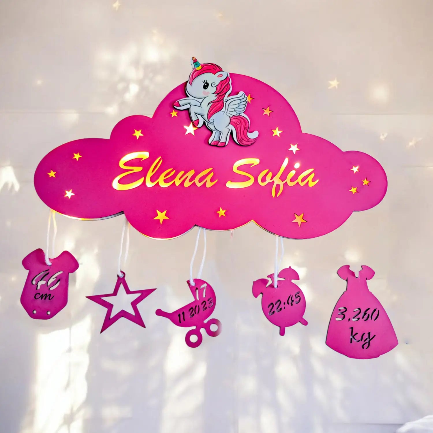 Lampa este realizata din materiale de calitate, are iluminare LED blanda, functioneaza pe baterii si este disponibila in culori delicate: roz, albastru sau alb. Personalizarea include numele copilului, data si ora nasterii, greutatea si inaltimea – tot ce face ca acest norisor sa fie un cadou de neuitat.