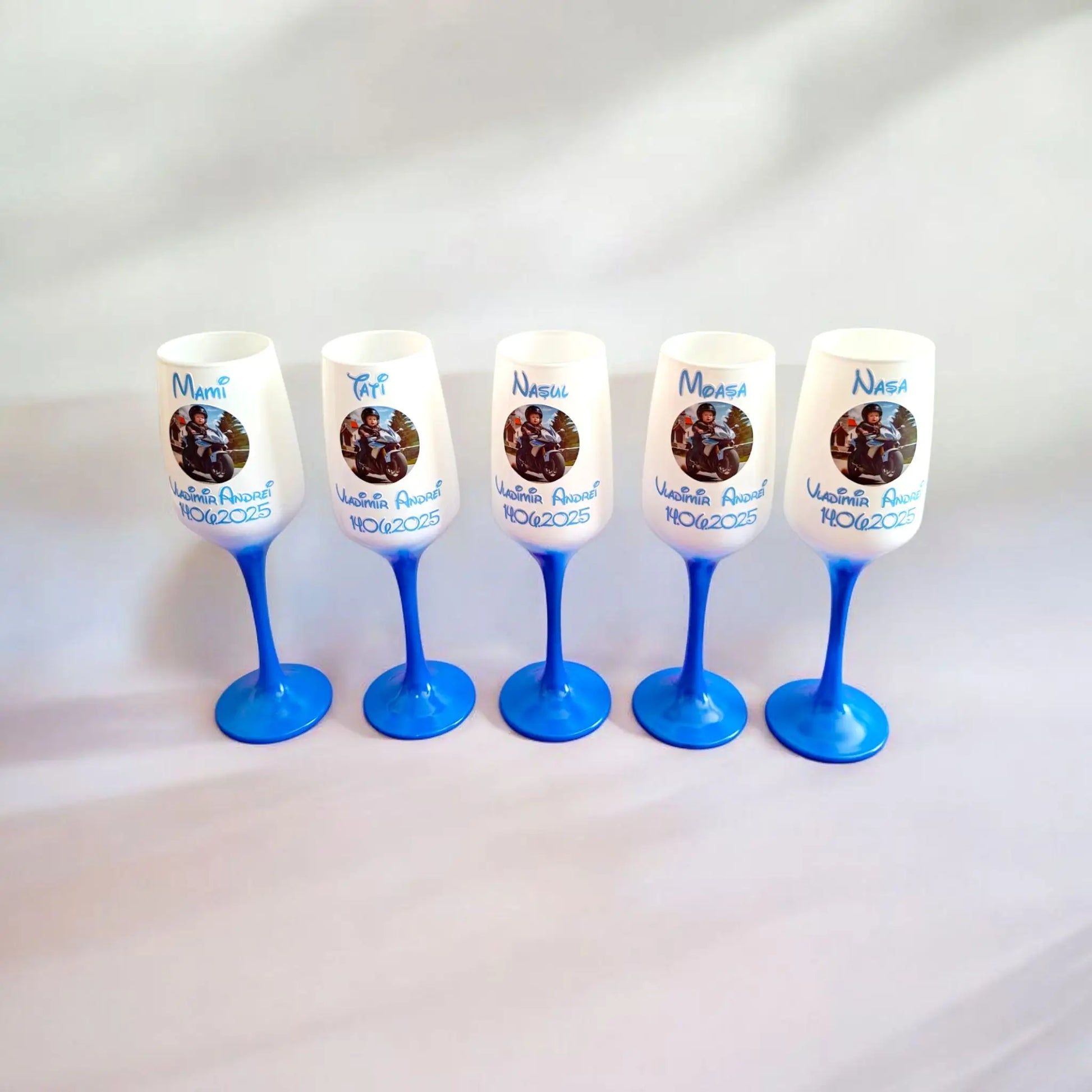 De asemenea, piciorul paharului poate fi vopsit în funcție de preferințe: albastru, roz, verde sau alb.