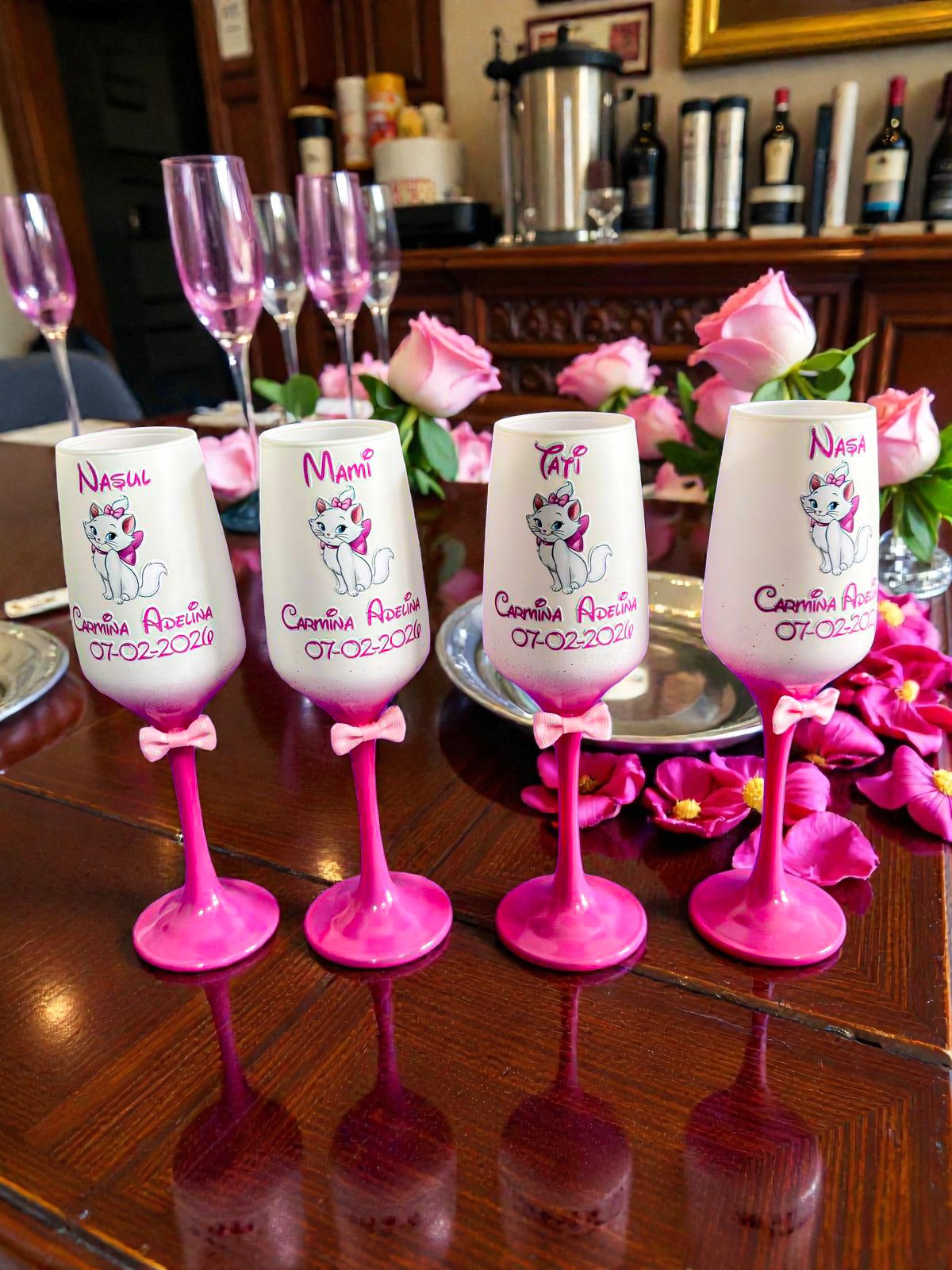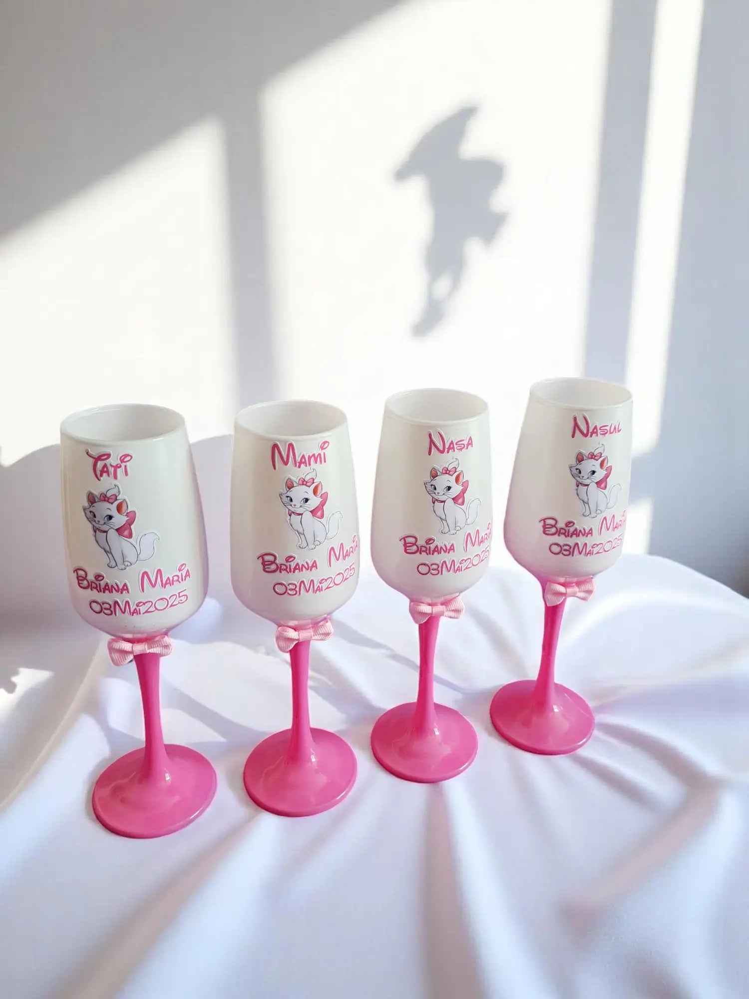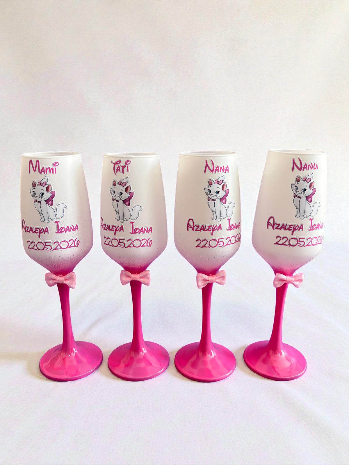 Fiecare pahar este realizat din sticlă de calitate superioară și personalizat cu elemente atent alese, astfel încât să reflecte emoția și importanța momentului.