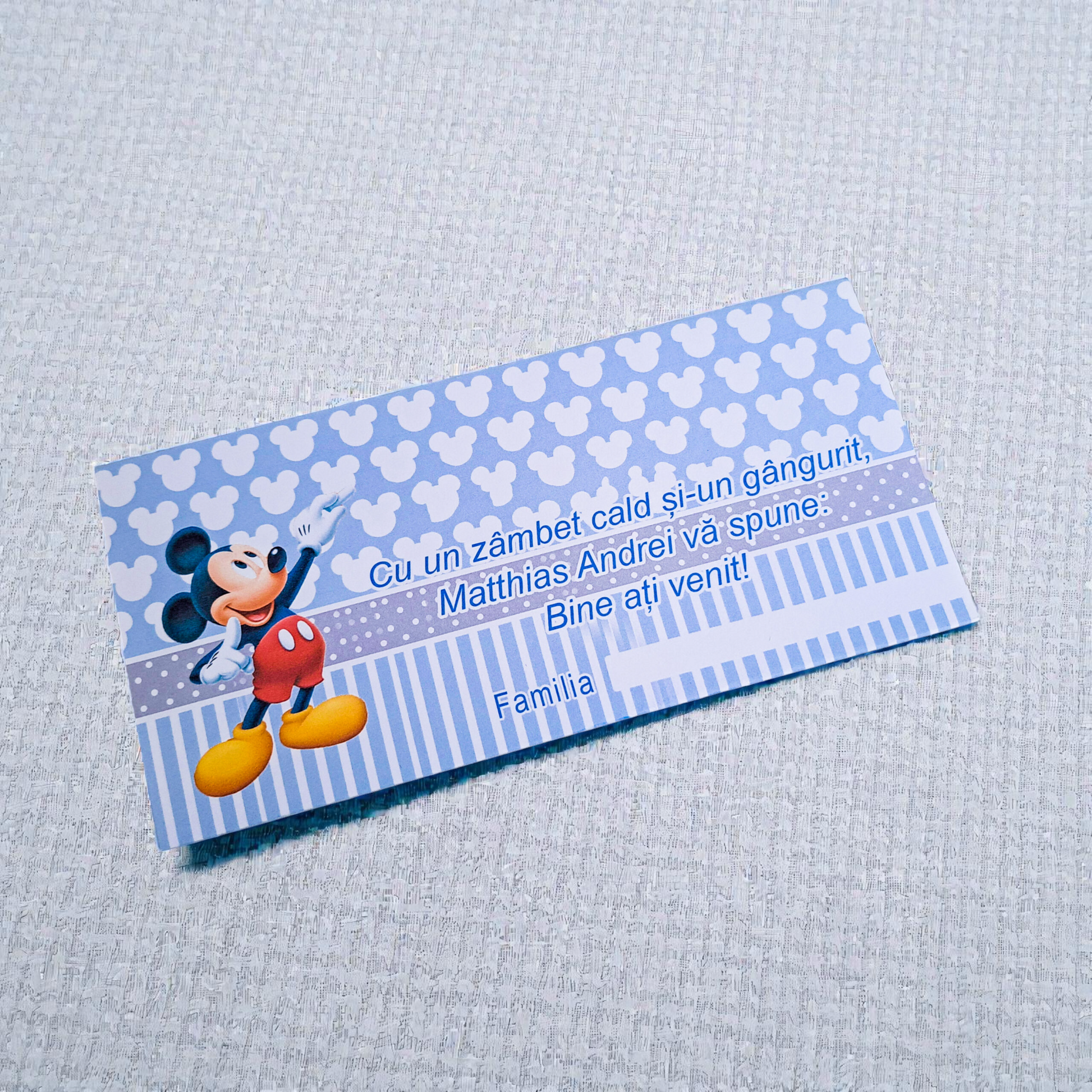Poate fi personalizat cu numele bebelușului, data evenimentului și un design potrivit botezului, ilustrat cu personaje simpatice sau elemente delicate. Fiecare plic este realizat individual, cu atenție la detalii, pentru un aspect elegant și bine finisat.