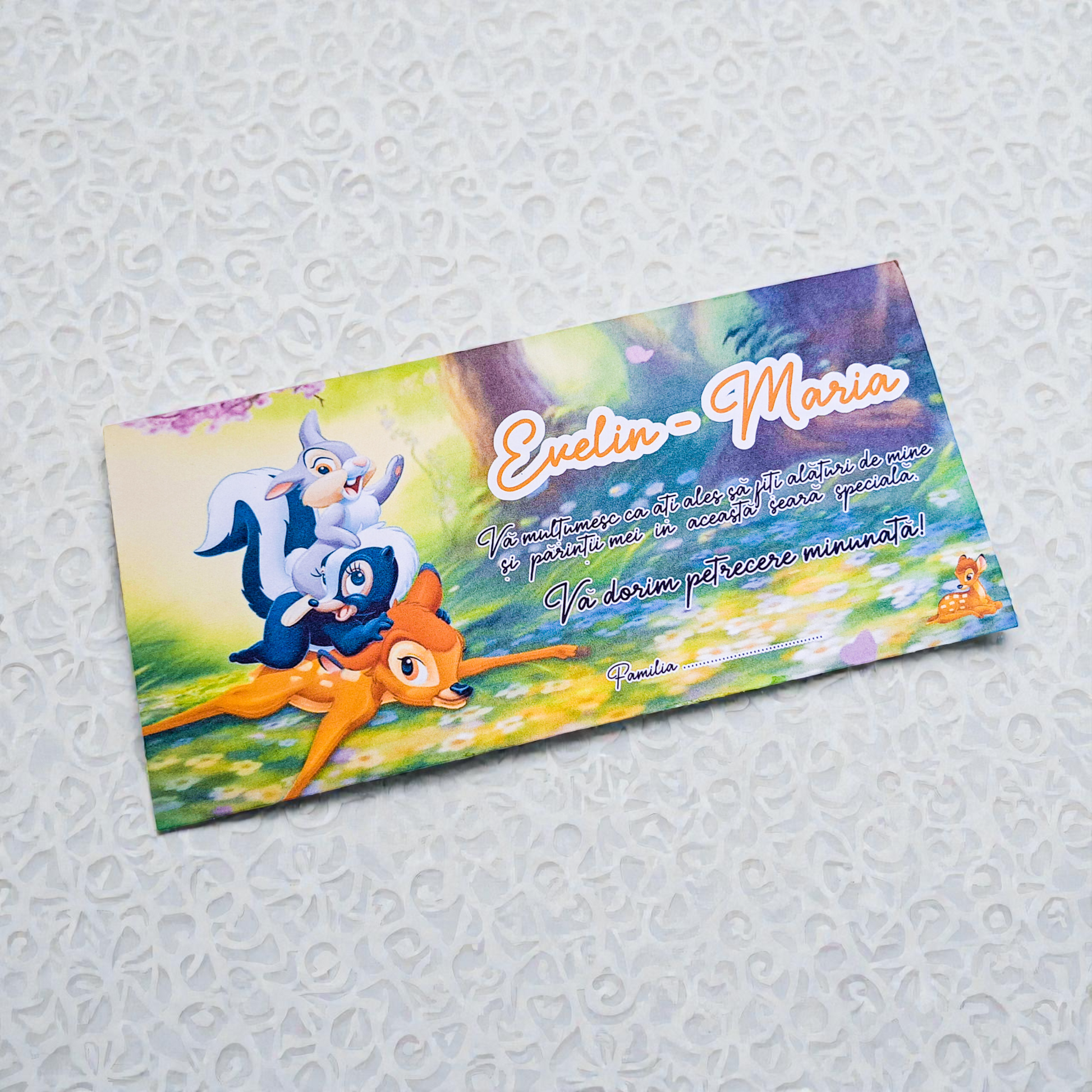 Poate fi personalizat cu numele bebelușului, data evenimentului și un design potrivit botezului, ilustrat cu personaje simpatice sau elemente delicate. Fiecare plic este realizat individual, cu atenție la detalii, pentru un aspect elegant și bine finisat.