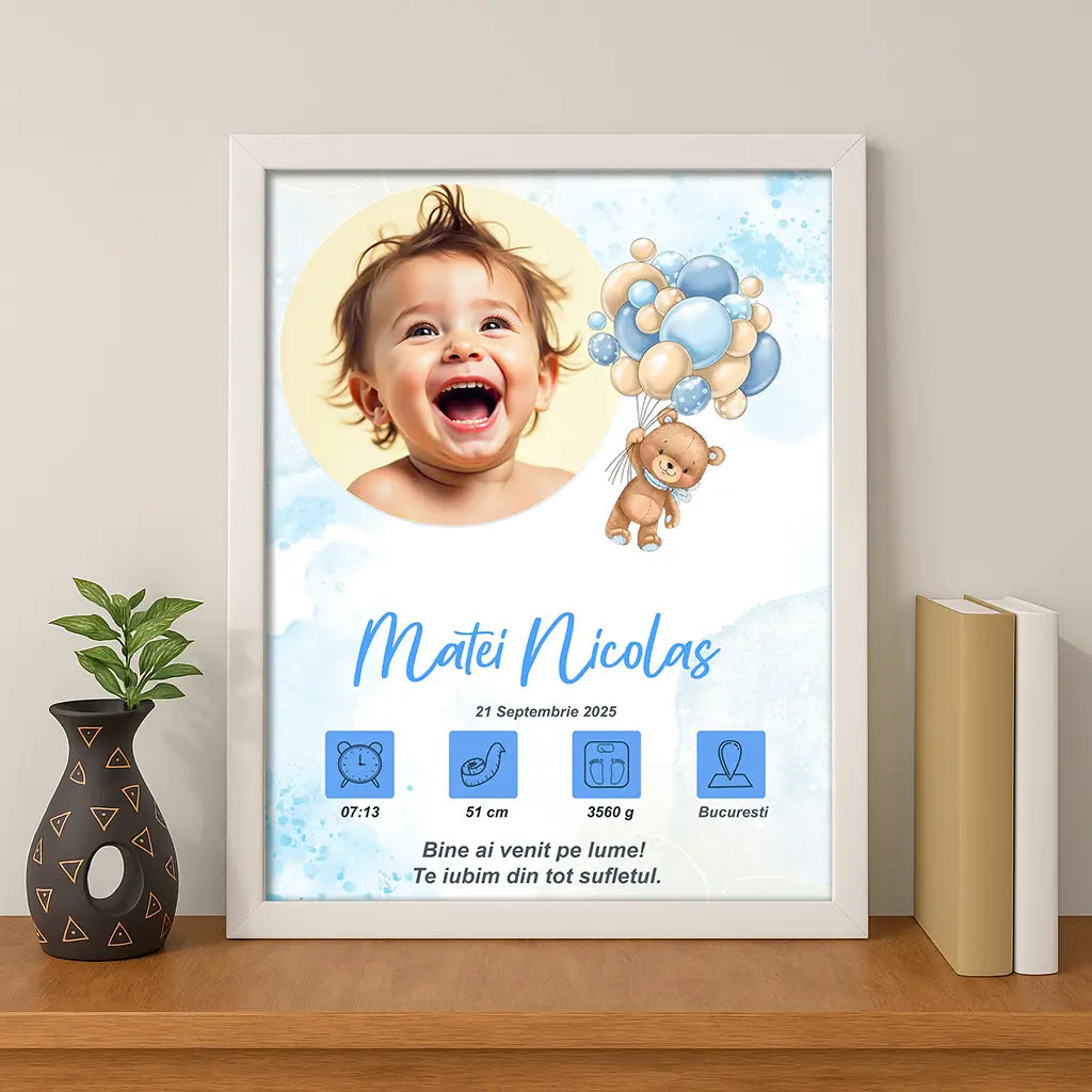 Tablou personalizat A4 cu fotografia și datele de la naștere ale bebelușului | Ursulet baietel cu baloane