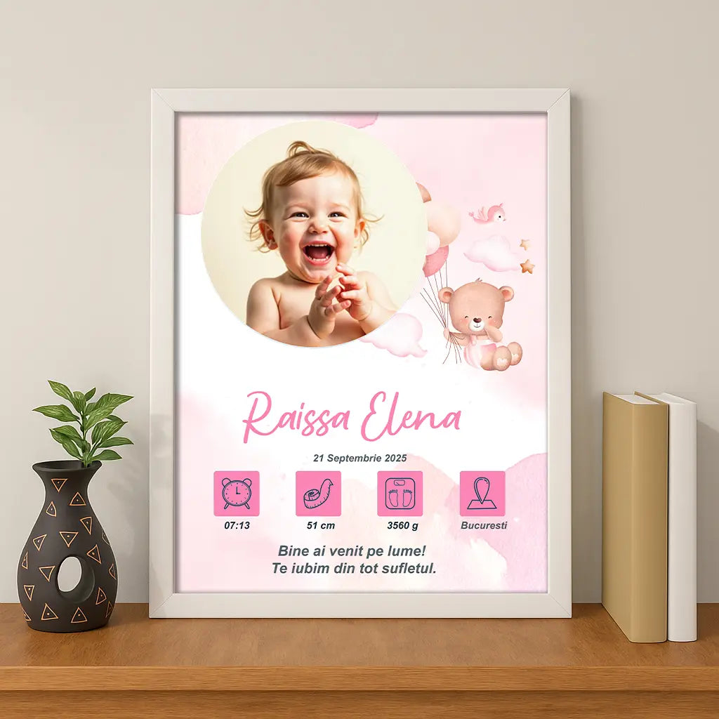 Tablou personalizat A4 cu fotografia și datele de la naștere ale bebelușului | Ursulet Roz 3