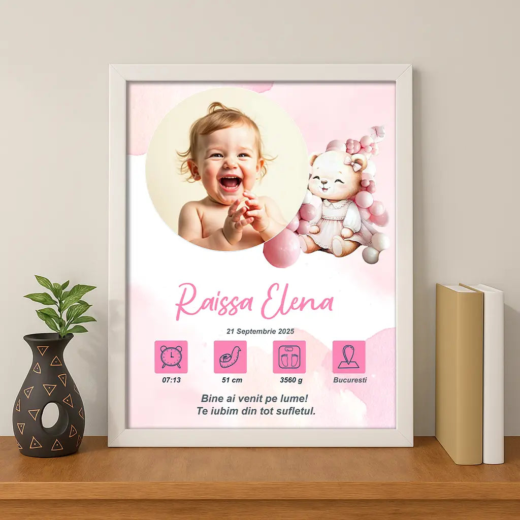 Tablou personalizat A4 cu fotografia și datele de la naștere ale bebelușului | Ursulet Roz 4
