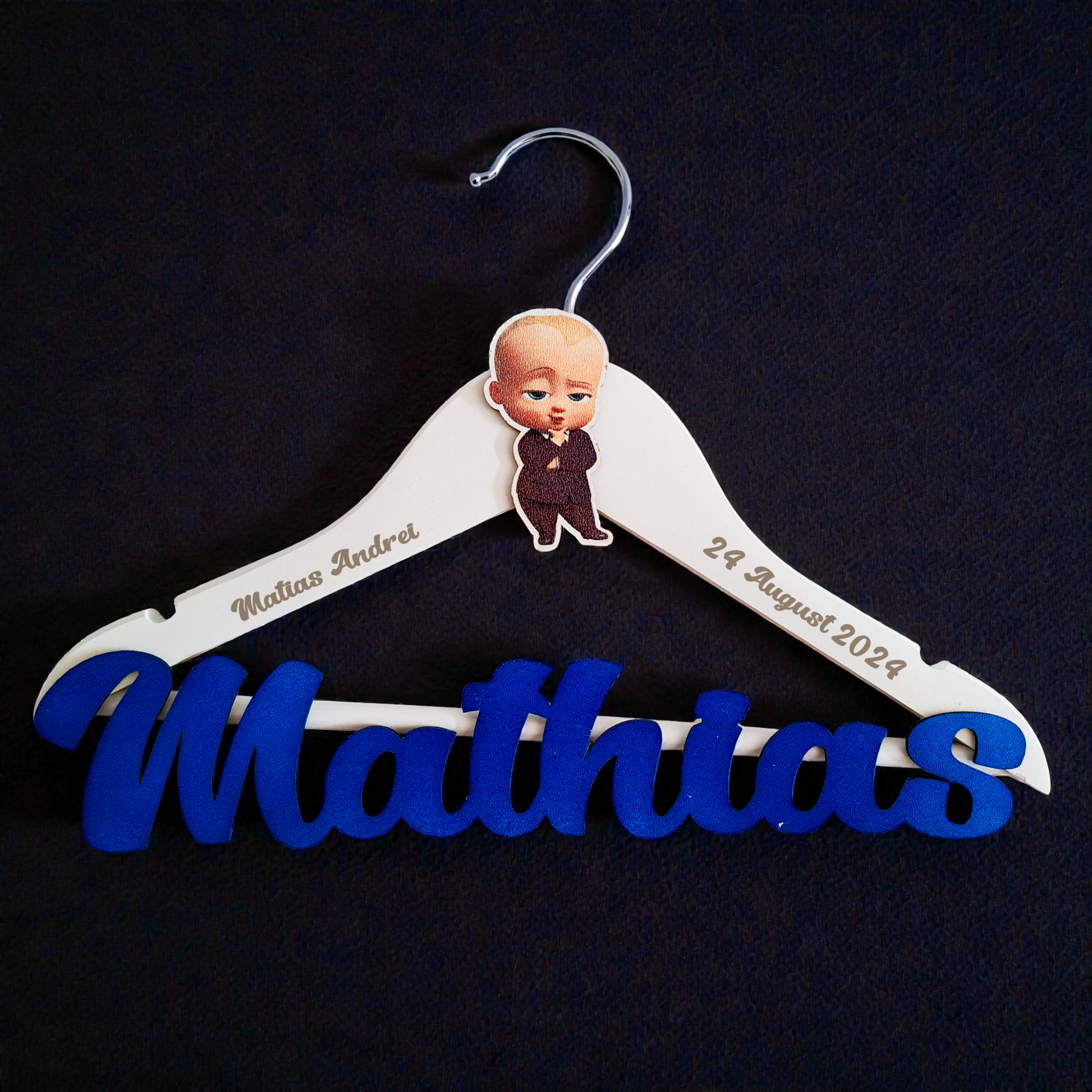 Umeraș personalizat pentru botez – Lemn alb, scris albastru | Model U 11