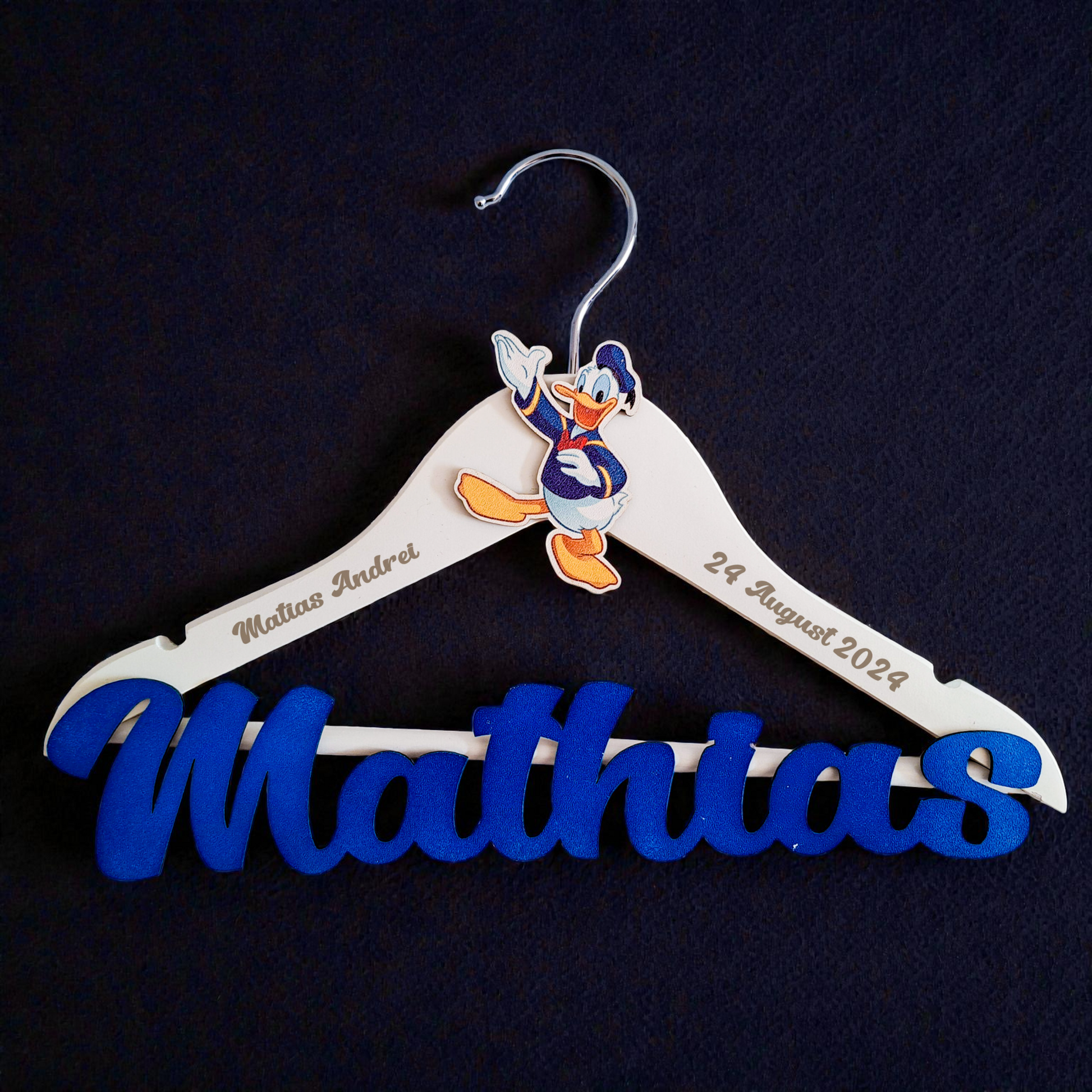 Umeraș personalizat pentru botez, confecționat din lemn, finisat în alb, personalizat prin gravare cu numele bebelușului și data evenimentului. Este alegerea perfectă pentru ținuta de botez sau pentru fotografii memorabile.